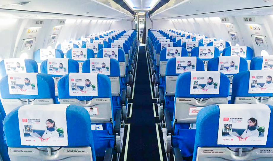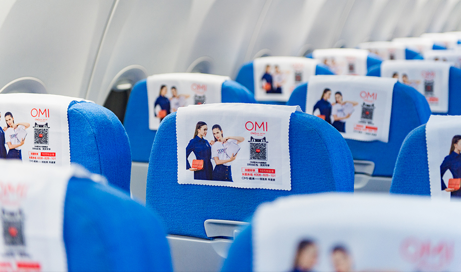 一進(jìn)入機(jī)艙,每個(gè)座椅上醒目統(tǒng)一的頭片廣告,全艙集中呈現(xiàn),營(yíng)造出一種沖擊力極強(qiáng)的視覺(jué)