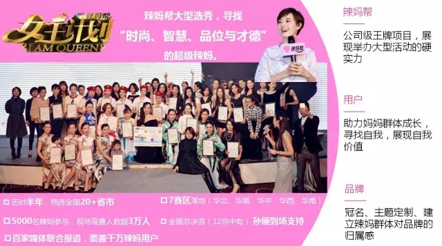 辣媽幫自2015年起與全國婦聯(lián)展開了為期五年的獨家合作,希望通過此舉打通全國醫(yī)務渠道,尋找到源頭用戶,將孕媽媽人群培養(yǎng)成為孕期伴侶、辣媽幫用戶,并通過社區(qū)固定用戶行為,利用辣媽商城、荷花親子將其有效轉化為購買人群。辣媽幫與全國婦聯(lián)的深度合作,每年將影響到1500多萬的孕媽媽,而這其中500多萬人會被轉化為辣媽幫用戶。