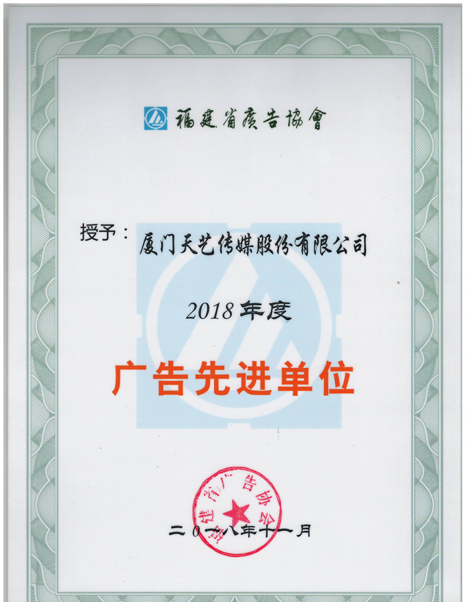 2018年福建省廣告界在推動(dòng)廣告業(yè)發(fā)展中,勇于開拓,努力創(chuàng)新,取得了優(yōu)異的成績(jī),為福建經(jīng)濟(jì)發(fā)展和社會(huì)進(jìn)步作出了巨大貢獻(xiàn),涌現(xiàn)了一批先進(jìn)單位。為了表彰先進(jìn),樹立典型,推動(dòng)工作,再創(chuàng)輝煌,福建省廣告協(xié)會(huì)于12月20日舉辦了第七屆第三次理事會(huì),并授予了廈門市天藝傳媒股份有限公司“福建省廣告先進(jìn)單位”的稱號(hào)。